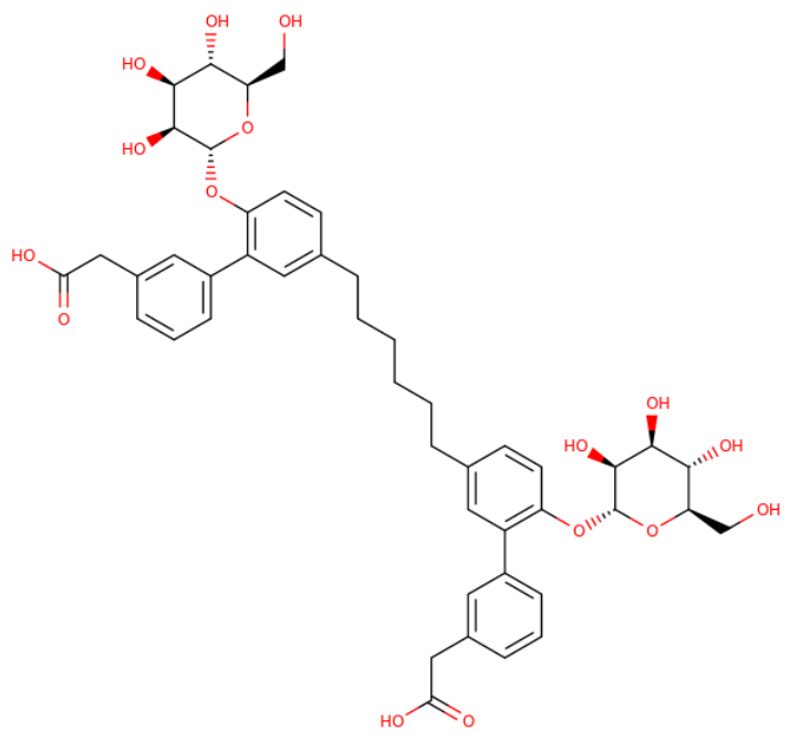 | IUPAC Name | 2-[3-[5-[6-[3-[3-(carboxymethyl)phenyl]-4-[(2R,3S,4S,5S,6R)-3,4,5-trihydroxy-6-(hydroxymethyl)oxan-2-yl]oxyphenyl]hexyl]-2-[(2R,3S,4S,5S,6R)-3,4,5-trihydroxy-6-(hydroxymethyl)oxan-2-yl]oxyphenyl]phenyl]acetic acid |