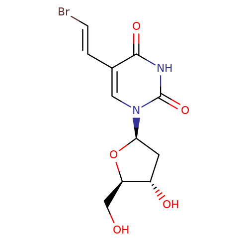 Synonyms | (E)-5-(2-bromovinyl)-2'-deoxyuridine, (Z)-5-(2-bromovinyl)-2'-deoxyuridine, 5-(2-bromoethenyl)-2'-deoxyuridine, 5-(2-bromovinyl)-2'-deoxyuridine, 5-BVDU, brivudin, brivudine, E-5-(2-bromovinyl)-dUrd, Z-5-(2-bromovinyl)-dUrd, Zostex |